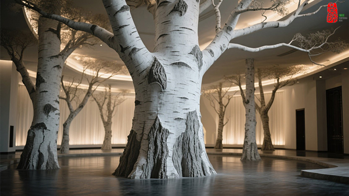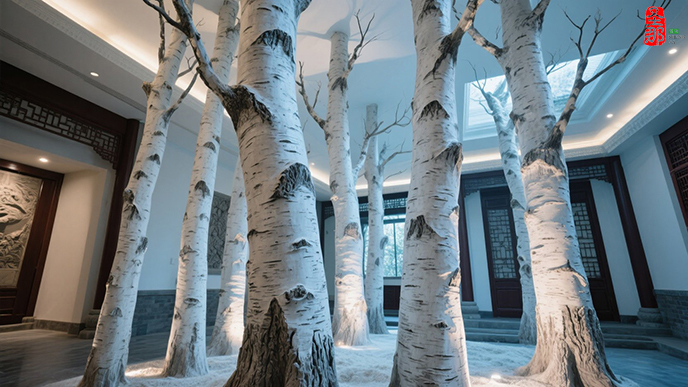 銀白雅韻映奢境!為北京博雅會所制作的高端仿真白樺樹