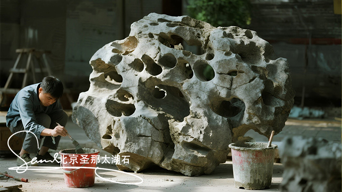 做仿真太湖石要有專用的工具,和做別的仿真假山不一樣,做仿真太湖石的工具是專用的,主要是各種像勺一樣的工具,把仿真太湖石的表面掏出大大小小的各種不同的洞穴。